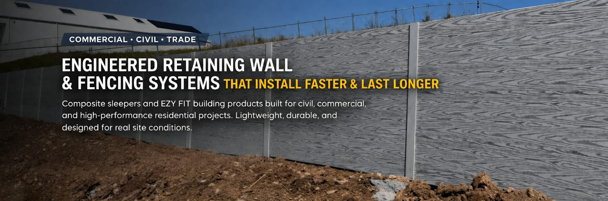 Ezzy Fit Pty Ltd can supply from 1 to 10,000+ lineal metres of FRP composite sleeper retaining wall systems and fencing products, given sufficient notice for any project.